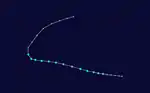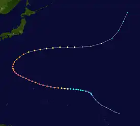 Isa developed from a disturbance in the monsoon trough near the Caroline Islands on April 12. It moved erratically at first, though after attaining tropical storm status it curved westward due to the subtropical ridge to its north. Isa very gradually intensified, and on April 20 the typhoon reached peak 1-min winds of 270 km/h (170 mph), as reported by the Joint Typhoon Warning Center; Japan Meteorological Agency reported maximum 10-min winds of 155 km/h (96 mph). After turning northward, it accelerated to the northeast, and merged with a larger extratropical cyclone on April 24.[7][8]