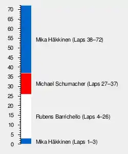 Michael Schumacher came in for a pit stop on lap 38, allowing Mika Häkkinen past. Häkkinen had been held up by Schumacher, so he began trying to build up enough of a gap so he could come out ahead of Schumacher after his own pit stop. Lap traffic delayed his progress at first, but after one lap he was able to turn in a couple of fast laps. He pitted on lap 42, and his fast laps combined with quick work by his pit crew allowed him to easily retain the lead over Schumacher.[4]