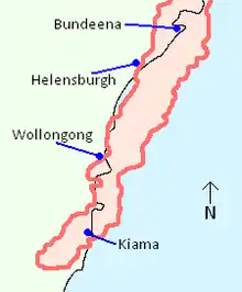 The storm cell formed at 4:25 pm AEST to the north of Nowra, roughly 115 km (71 mi) south-southwest of Sydney. After forming, it initially headed towards the coast in a northeasterly direction. The cell passed just to the west of Kiama at around 5:15 pm and gained a 'severe' classification from the Bureau of Meteorology at the same time.[15] 'Severe' is a classification used by the Bureau of Meteorology for thunderstorms which meet a specific criteria, namely producing hailstones with a diameter of 2 cm (0.8 in) or more, wind gusts of 90 km/h (56 mph) or greater and flash flooding, or tornadoes. This classification is also used by the Bureau to classify the attributes of a storm at any given time during its life.[7][16]