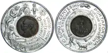 When the revolution of 1848 was over, the Lombardy-Venetia Kingdom came under the rule of the revolutionaries, and the Provisional Government of Milan and the Republic of San Marco were born. Following these events, the Kingdom of Sardinia began the first war of independence, and the two newly formed revolutionary governments replaced the Austrian lira with a new coinage based on the Savoy lira. In particular, the Republic of San Marco, with Decree No. 565 of January 15, 1849, minted 2760000 1-cent coins of the current lira in the Venice mint, with different measurements than the Savoy lira; the coin, although made of copper, was 18 mm in diameter and weighed 1 g.[17][18] The Risorgimento came into full swing when the insurgent Legation of Romagne between 1859 and 1860, in order to avoid continuing to use the papal coinage, began minting 1-cent coins reusing Carlo Felice's old 1826 coinage.[19][20] The provisional government of Tuscany also minted new coinage and so in 1860 commissioned the Ralph Heaton Firm of Birmingham to mint new 1-cent coins bearing the year 1859, using the Sardinian format of 1842.[21][22]