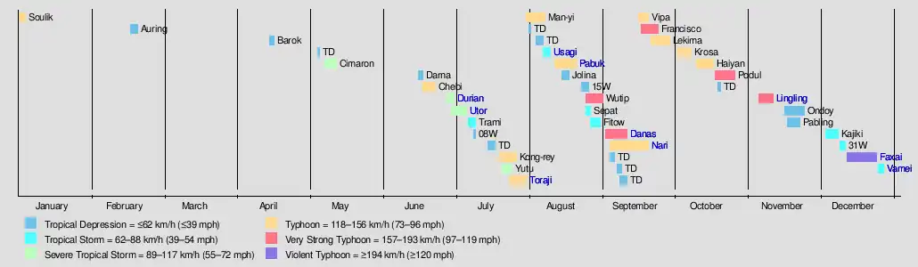 The season was relatively inactive, with the first named storm, Cimaron, not developing until May 9. Taiwan suffered the most destruction from typhoons this year, with Typhoons Toraji, Nari, and Lekima being responsible for nearly 300 deaths in that island alone, making it one of the deadliest typhoon seasons in recorded history in that island. In November, Typhoon Lingling impacted the Philippines, killing 171 people, making it one of the deadliest Philippine storms this century. The season ended with the formation of Tropical Storm Vamei during the last week of December. Vamei would be notable for becoming the lowest latitude tropical storm, at 1.4°N, ever to be observed in the Northwest Pacific.