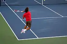 Day 2 saw the first round matches from the bottom half of the draw begin; Fernando González, Fernando Verdasco, Ivo Karlović, Tommy Robredo, Igor Andreev, and Paul-Henri Mathieu all progressed.[14] Defending champion and number two seed Roger Federer, playing his first Grand Slam since the 2004 Australian Open at a seeding lower than number one, beat Máximo González 6–3, 6–0, 6–3,[15] and Andreas Seppi, the thirty-first seed, triumphed in five sets (6–3, 7–5, 3–6, 3–6, 6–3) over Hyung-taik Lee. Four seeds exited the tournament: Richard Gasquet, who lost in five sets to former world number two Tommy Haas; Tomáš Berdych, who lost to home favorite Sam Querrey in a humbling 6–3, 6–1, 6–2 scoreline;[16] Canada Masters runner-up Nicolas Kiefer, who retired at two sets to one and 4–1 down in his match against Ivo Minář; and Mikhail Youzhny, who withdrew due to a viral illness.[14][17][18]