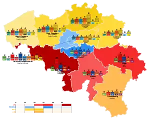 After polls showed the N-VA receiving 29% of votes in their region, media interpreted the election as a "victory for Flemish independence".[25] The following tables contain percentages on the national level (i.e. the result of N-VA is 17.4% on the national level, while it is 27.8% on the regional level).