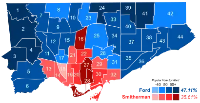 Ford's message of putting taxpayers' interests before that of labour and special interests was also said to have attracted wide support among diverse immigrant communities in the inner-city and suburbs (whose demographics contrast sharply with the "urbane creative class" of The Beach and the Annex neighborhoods). By contrast, "people knew precisely nothing about what George Smitherman stood for", according to a spokesman for George Smitherman, who was considered Ford's chief opponent.[7][10][11]