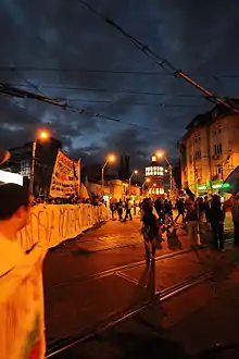 The wave of protests started on 1 September 2013 with a national mobilization and continued until late-December. The protests attracted up to 200,000 demonstrators in 50 Romanian cities and 30 cities in Romanian diaspora.[97] Largest demonstrations were organized in Bucharest (20,000 people),[96] Cluj-Napoca (10,000 people),[98] Câmpeni (4,000 people),[99] and Iași (1,500 people). In Bucharest, Timișoara and Iași, protesters created "tent cities", paralyzing traffic on major arteries of circulation. The protests, dubbed by international media the "Romanian Autumn",[100] have taken many forms: human chains around the Palace of the Parliament, flash mobs, roadblocks and scuffles with police. Although the protests were mainly peaceful, there were reports of serious incidents. On 13 September, Minister of Culture Daniel Barbu was attacked with tomatoes in Cluj-Napoca. In November, protesters in Bucharest, Brașov and Cluj-Napoca were aggressed and sprayed with irritant substances by gendarmes, in the capital 62 people being fined for blocking traffic.[101] Likewise, on 9 December, about 50 Greenpeace activists from 10 countries who were protesting in the courtyard of the Parliament building, were seized by gendarmes and led to the police stations. Protesters also accused the poor coverage of the protests by Romanian media.