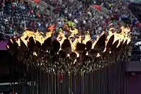 The 2012 Summer Olympics and Paralympics cauldron was used for the Olympic flame during the Summer Olympics and Paralympics of London 2012. The cauldron was designed by Thomas Heatherwick and described as "one of the best-kept secrets of the opening ceremony": until it was lit during the Olympics ceremony, neither its design and location, nor who would light it, had been revealed.[1] For the Olympics it consisted of 204 individual 'petals', and for the Paralympics 164, one for each competing nation.[2]