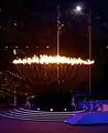The seven stepped forward together to light a petal each. Flames spread radially around the petals, and when all were alight, the stems rose slowly from the floor of the arena and converged to form an upright cauldron with a single, massive flame. An audible gasp went around the stadium as it lifted.[27][28] The music performed during this part of the ceremony was the specially-commissioned "Caliban's Dream".