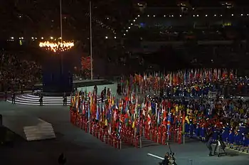 During the closing ceremony of the 2012 Summer Olympics in London, the flag bearers of 205 National Olympic Committees (NOCs) arrived into the main Olympic Stadium. The flags of each country were not necessarily carried by the same flag bearer as in the opening ceremony.