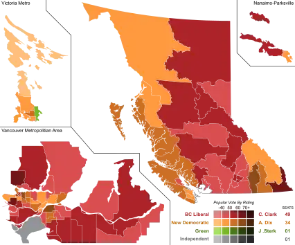 The Liberal Party won its fourth straight majority; Clark was defeated in her riding, but she was re-elected to the legislature in a subsequent by-election in Westside-Kelowna on July 10, 2013,[2] after Liberal MLA Ben Stewart stepped down on her behalf.[3] The NDP remained the official opposition, losing two seats, and the Green Party won its first seat.