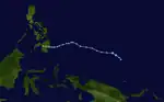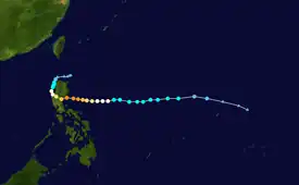 A day after Bavi dissipated, a low-pressure area formed southwest of the Marshall Islands. It slowly drifted northwestward and became more organized over the next two days.[68] The next day, the JMA started tracking the system as a tropical depression.[69] On March 27, the JTWC started tracking the system as a tropical depression, and designated it 04W.[70] Moving west-northwestward, the system's center became more consolidated with convective banding becoming wrapped into it. The JTWC upgraded 04W to a tropical storm the same day.[71] The JMA followed suit later that day, when it was named Maysak.[72] On March 28, Maysak developed an eye,[73] and the JMA further upgraded it to a severe tropical storm.[74] The eye became more well defined with deep convection persisting along the southern quadrant of the storm. The overcast became more consolidated,[75] as the JMA upgraded Maysak to a typhoon on the same day.[76] On March 29, Maysak rapidly intensified over a period of 6 hours, attaining 1-min maximum sustained winds of 230 km/h (145 mph), making it a Category 4 equivalent on the SSHWS.[77] On the next day, Maysak further intensified into a Category 5-equivalent super typhoon. On April 1, the PAGASA stated tracking on the system, naming it as Chedeng. Typhoon Chedeng (Maysak) weakened more and eventually dissipated in the Luzon landmass. The remnants of Maysak eventually made it to the South China Sea.[78]