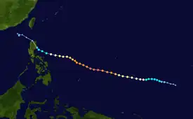 On May 3, a tropical disturbance south southeast of Pohnpei began to organize, and the JMA upgraded the disturbance into a tropical depression.[99] Late on May 6, the JTWC started issuing advisories and designated it as 07W.[100] On May 9, the JMA upgraded the depression into a tropical storm and named it Dolphin.[101] The JMA further upgraded Dolphin to a severe tropical storm on May 12,[102] and on the following day, the JTWC upgraded Dolphin to a typhoon.[103] Six hours later, the JMA had followed suit.[104] Over the next few days, Dolphin continued to intensify until it reached Category 5 super typhoon status on May 16. It weakened into a category 4 super typhoon 12 hours later, until it weakened into a category 4 equivalent typhoon after maintaining super typhoon status for 30 hours. Dolphin weakened further into a severe tropical storm on May 19, as the JTWC downgraded Dolphin into a tropical storm and issued their final warning. On May 20, the JMA issued their final warning, and the JTWC and the JMA declared that Dolphin had become an extratropical cyclone.[105][106]