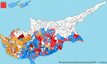 Presidential elections were held in Cyprus on 28 January 2018.[1] As no candidate received a majority of the vote in the first round, a run-off was held on 4 February between the top two candidates, incumbent President Nicos Anastasiades of the Democratic Rally (DISY) and Stavros Malas of the Progressive Party of Working People. Anastasiades emerged as the winner with 55.99% of the vote.[2]