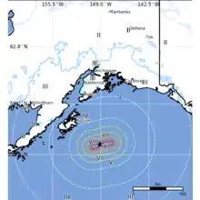 According to the United States Geological Survey, the earthquake occurred 175 miles (282 km) southeast of Kodiak, Alaska at 12:31 AM local time (AKST).[2] Witnesses to the earthquake itself reported that it was very long in duration, feeling like a "slow roller," but it was not a violent earthquake despite its magnitude and mercalli intensity, as its epicentre was hundreds of kilometres offshore. This was corroborated by witnesses in Anchorage.[9][7] There was no immediate damage reported.[7] The earthquake woke people in Anchorage, 350 miles (560 km) from the epicenter, and was felt as far as Fairbanks to the northeast and British Columbia to the southeast.[5][6] The earthquake's S-waves arrived in Anchorage within one minute, and reached Fairbanks within three minutes.[10]