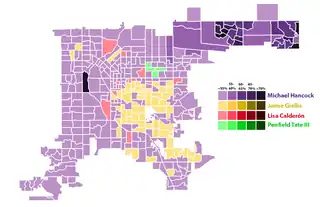 The 2019 Denver mayoral election was the 2019 edition of the quadrennial elections held to determine the Mayor of the City of Denver, Colorado. The election was held on May 7, 2019.[1] Since no candidate received a majority of votes, a runoff election was held on June 4, 2019, between the two candidates with the most votes, incumbent Mayor Michael Hancock and Jamie Giellis.[2] Hancock defeated Giellis in the runoff election, winning a third term as Mayor, and becoming the first mayor to be reelected to a third term since Wellington Webb in 1999. Hancock's third inauguration was held on July 15, 2019.[3]