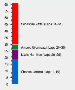 Lewis Hamilton, who was yet to stop, inherited the lead of the race. Valtteri Bottas made his pit stop at the end of lap 22, emerging behind Verstappen and ahead of Alexander Albon, maintaining his net position. Hamilton was left out on ageing soft-compound tyres until the end of lap 26, in the hope that the Ferrari drivers, at the time running in sixth and seventh, would be slowed down by the midfield cars ahead. This plan did not work, and Hamilton emerged from the pits not only behind both Ferrari drivers, but also almost six seconds behind Verstappen. Hamilton did come out ahead of his teammate Bottas, who was instructed to slow down after his pit stop to ensure Hamilton would leave the pit lane ahead of him. Due to the slow pace of the lead cars in previous laps, they emerged behind the midfield cars of Antonio Giovinazzi, Pierre Gasly, Ricciardo and Lance Stroll. Vettel and Leclerc began to make their way through this group, with Vettel cementing his net lead by clearing the cars quicker than his teammate. Giovinazzi held the lead of the race for four laps until he was overtaken by Vettel on lap 31. This marked the first time a team other than Mercedes, Ferrari or Red Bull had led a race lap since Bottas led for Williams at the 2015 British Grand Prix and the first time Alfa Romeo had done so since Andrea de Cesaris led the 1983 Belgian Grand Prix.