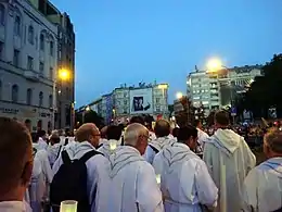 The General Secretariat of the Budapest International Eucharistic Congress was formed, and Péter Erdő nominated its chief secretary, Kornél Fábry (priest of the Diocese of Kaposvár). The secretariat started working in the Primate's Palace in Buda Castle, but it would be provided with its own headquarters in Vörösmarty Street. Eight subcommittees supported its work, responsible for the fields of theology, liturgy, arts, finances, media and event organisation. The theological committee had to define the theme of the congress, and propose a motto by March 2017 for the pope to decide.[4] It was announced that COVID-19 prevention methods such as masks weren't mandatory for visitors and atteendes.[5] Due to the COVID-19 pandemic, the event originally scheduled for September 2020 was postponed for a year.[1]
