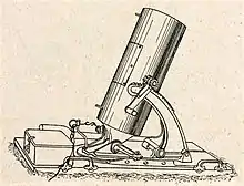 The LadungsWerfer consisted of a rectangular wooden base 1.15 m (3 ft 9 in) long by 59 cm (1 ft 11 in) wide with sheet metal reinforcement along its edges with four handles at the corners for carrying by its crew. There was a cast-iron swivel, attached to the base that was screwed into the base of the barrel and locked in place with a handle. At the front of the swivel, there was a crescent-shaped geared barrel support that attached to a crank on the side of the barrel to adjust elevation that also had a locking lever.[8] Next to the elevation gear, there was a slot that held an inclinometer sight to aim the mortar. There was also a crescent-shaped rail along the front of the base that could be adjusted for the traverse. The large smoothbore barrel was 24.5 cm (9.6 in) in diameter but the German designation rounded down to the nearest centimeter. The advantage of the LadungsWerfer was that they were cheaper to build and easier to transport than the 25 cm schwerer Minenwerfer but they were shorter ranged.[1]