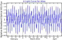 Low amplitude variability of the brightness of Atlas was tentatively detected in observations by STEREO and clearly detected by Kepler/K2. The light curve varies with several periods, the most prominent being 2.427, 0.7457 and 1.214 days.[10]