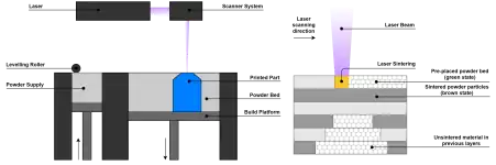 In selective laser sintering, powdered food materials are heated and bonded together forming a solid structure. This process is completed by bonding the powdered material layer by layer with a laser as the heat source. After a layer is completed with the desired areas bonded, it is then covered by a new unbonded layer of powder. Certain parts of this new unbonded layer are heated by the laser in order to bond it with the structure. This process continues in a vertical upwards manner until the desired food model is constructed. After construction, unbonded material can then be recycled and used to print another food model.