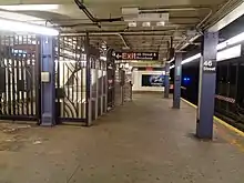 Both platforms have one same-level fare control area at either ends and there are no crossovers or crossunders. The full-time side is at the west (railroad south) end of the Manhattan-bound platform. It has a turnstile bank, token booth, and one staircase to the northwest corner of 46th Street and Broadway. The fare control area on the same end of Forest Hills-bound platform has a part-time turnstile bank and token booth (with two High Entry-Exit Turnstiles providing access to and from the station at all times) and one staircase to the southwest corner of 46th Street and Broadway.[23]