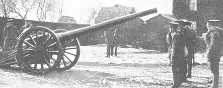 9th Heavy Battery disembarked at Le Havre on 12 May and entrained the same night for Arques. It then marched to Helfaut, arriving on 16 May.[4][5][10] Artillery policy in the BEF was to withdraw heavy batteries from the divisions and group them into dedicated heavy artillery formations, so 9th Hvy Bty left 9th (Scottish) Division on 16 May and joined the Heavy Artillery Reserve.[4][2][7][8][10] It was ordered up to Pont de Nieppe, near Armentières, where it established its wagon lines on 18 May and where the men were billeted in local farms. The battery took over gun positions previously occupied by the Regular 31st Hvy Bty and immediately went into action, 'A' Sub-section firing its first round on the evening of 19 May.[4][5][7][11]
