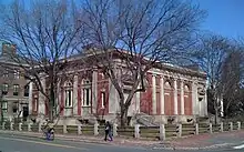 Lowell's health declined slowly and his lifelong hearing problems worsened. He resigned his position as Harvard's president on November 21, 1932, and served through the following summer.[62] During his years as president, enrollment at the College expanded from 3,000 to 8,000 and its endowment grew from $23 to $123 million. Lowell's construction projects, some based on the Freshman Halls and the College system, but including Widener Library, the Memorial Church and many others, had transformed the university's infrastructure.[63] Also among the new campus buildings of Lowell's tenure was the President's House (later called Loeb House) at 17 Quincy Street, which Lowell commissioned from his cousin Guy Lowell. It remained the residence of succeeding Harvard Presidents until 1971.