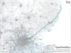 The A12 is a major road in Eastern England. It runs north-east/south-west between London and the coastal town of Lowestoft in the north-eastern corner of Suffolk, following a similar route to the Great Eastern Main Line until Ipswich. A section of the road between Lowestoft and Great Yarmouth became part of the A47 in 2017.[3] Between the junctions with the M25 and the A14, the A12 forms part of the unsigned Euroroute E30 (prior to 1985, it was the E8). Unlike most A roads, this section of the A12, together with the A14 and the A55, has junction numbers as if it were a motorway.