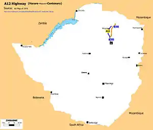 The A12 is a road in Zimbabwe running from the A11 just past Mazowe, just over 30 km from Harare, to Centenary about 145 km (90.1 miles) from Harare. [1]