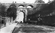 After the Archway roundabout, the A1 enters a cutting, and becomes Archway Road. The original road north went up the very steep Highgate Hill (now the B519) to the village of Highgate. By 1808 this was proving unsuitable for increasingly heavy traffic, and a road, crossing the hill through a tunnel at a shallower gradient, was proposed by a mining engineer, Robert Vazie; a turnpike trust – the Highgate Archway Company – was set up and work started in 1810.[2] The brick built tunnel collapsed during construction on 13 April 1812, and John Nash constructed a brick bridge, using a series of arches like a canal viaduct, to carry Hornsey Lane over what was now a cutting.[2]