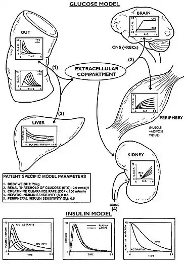 - ↑ Lehmann ED, Deutsch T (May 1992). "A physiological model of glucose-insulin interaction in type 1 diabetes mellitus". J Biomed Eng. 14 (3): 235–42. doi:10.1016/0141-5425(92)90058-s. PMID 1588781.