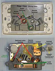 A view of the wiring side of a typical dual socket-outlet is also shown on the right, together with an annotated view of the mechanism, without the front cover. (One "rocker" switch has been disassembled to show its operation.)