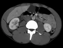 The kidneys may also be injured; they are somewhat but not completely protected by the ribs.[6] Kidney lacerations and contusions may also occur.[13] Kidney injury, a common finding in children with blunt abdominal trauma, may be associated with bloody urine.[13] Kidney lacerations may be associated with urinoma or leakage of urine into the abdomen.[4] A shattered kidney is one with multiple lacerations and an associated fragmentation of the kidney tissue.[4]