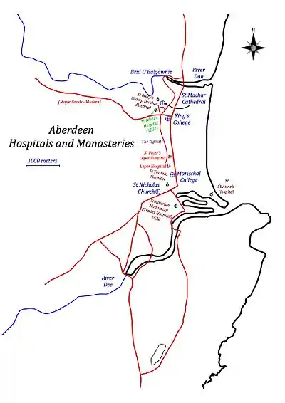 - ↑ The work by Cowan & Easson and Hall's survey of Monastic Landscapes provide extensive gazetteers of known Aberdeen hospitals. Derek Hall, Scottish Monastic Landscapes (Stroud: Tempus, 2006), pp. 222 p., 16 p. of plates.; and, Ian Borthwick Cowan, David Edward Easson, and Richard Neville Hadcock, Medieval Religious Houses, Scotland with an Appendix on the Houses in the Isle of Man. 2nd edn (London: Longman, 1976), pp. xxviii, 252p,[4]fold plates.