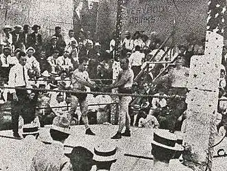 The 5' 4" welterweight Hollandersky lost to Panama Joe, the younger and stronger Panamanian Light and Middleweight champion, and the accomplished middleweight Connors of Scranton, Pennsylvania, who had a five-inch height advantage. But he gave a closer fight to the Seattle welterweight Ryan before an impressive crowd of 1500 at the Savannah Club in Ancon, Panama on February 23, 1914. The Panamanian fans voiced their disapproval of the referee's Draw ruling as Hollandersky appeared to have landed more blows.[84] The Norwich Bulletin felt Hollandersky had the edge in the Ryan bout which they referred to as a "Welterweight Championship of the Isthmus." Perhaps as a result, Abe's fight records at the end of his autobiography and Nat Fleischer's 1944 Ring Record Book referred to Hollandersky as a Welterweight Champion of Panama, though his actual title was heavyweight champion.[85]