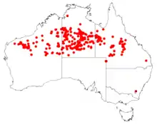 It is endemic to northern parts of Western Australia, central parts of the Northern Territory[1] and parts of central Queensland and in far north east South Australia near Lake Eyre the range extends from around Roebourne in the west through central Queensland in the east. It is found flat plains and hillsides[2] growing in reddish sandy, loamy and gravelly soils and is usually part of spinifex grassland communities.[2]
