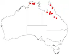 It is native to areas around the Einasleigh River in central-northern Queensland and is found on a sandstone plateau to the south of the Goomadeer River and also along Coopers Creek near Nabarlek in the Northern Territory and is known to grow in rocky, sandy or shallow soils along creek banks and river flats and floodplains.[2]