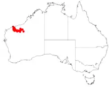 It is native to an area in the Pilbara region of Western Australia where it is commonly situated on stony flats and low rocky hills growing in shallow rocky soils.[2] The range of the plant is from around Millstream Chichester National Park in the west to around Nullagine in the east and as far south as the Hamersley Range near Wittenoom. It is quite common in areas where it is found but has an overall scattered distribution. It is usually a part of shrubland communities that is dominated spinifex.[1]