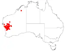It is native to an area in the Wheatbelt, Mid West and Goldfields-Esperance regions of Western Australia where it is commonly situated on plains, breakaways and laterite or granite hills growing in clay, loamy, sandy or rocky soils.[2] It has a scattered distribution with the bulk of the population found from around Byro Station in the north to around Morawa in the south to around Cue in the east as a part of scrubland communities dominated by other species of Acacia.[3]