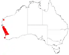 It is native to an area in the Wheatbelt and the Mid West regions of Western Australia. It is found as far north as an area in between Denham and Kalbarri to around Piawaning in the south[2] on sand plains and gentle rises where it grows in sandy lateritic soils.[1] The shrub is usually part of the understorey in woodland or tall shrubland communities.[2]