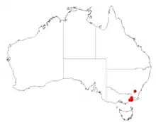 It has a limited distribution in Victoria where it is only found in the Lakes Entrance and Buchan areas. It is found as remnant populations mostly in clay soils over limestone as a part of Eucalyptus woodland communities. Its natural habitat is under threat of land clearing.[3]