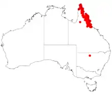 It is endemic to Queensland where it is situated in coastal areas from the Cape York Peninsula down to around Townsville in the south. It is often found on steep hillsides growing in shallow rocky soils derived from granite or sandstone as a part of Eucalyptus woodlands or open forest communities but can also be found in heath or scrubland area growing in sandy soils near the coast.[1]