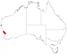 It is native to an area along the west coast in the Wheatbelt region of Western Australia between Dandaragan in the north to Chittering in the south where it is found on and among breakaways and lateritic ridges growing in sandy or loamy soils over lateritic gravel.[1]