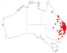 It is endemic to an area from south eastern Queensland in the north to northern New South Wales in the south[3] where it is common in coastal areas from around the Mooloolah River in Queensland down to the Hastings River in New South Wales[4] on hillsides or plateaux growing in sandy or stony sandy loams often over shale as part of the understorey in Eucalyptus forest communities.[2]