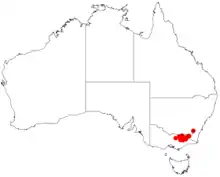 It is endemic to the southern parts of New South Wales and northern Victoria.[3] In Victoria the shrub is considered rare and is found in the Snowy Mountains, Victorian Alps and highlands with the bulk of the population confined to the montane and subalpine forests on the Buffalo Range and at Sassafras Gap.[1] It extends into the far south east of New South Wales in the snowy mountains at higher altitudes where it is found growing in granitic soils as a part of wet sclerophyll forest and woodlands.[2]