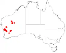 It is found in scattered populations in the Wheatbelt and Mid West regions of Western Australia.[1] Its range extends from near Mingenew southeast to the between Ballidu and Kalannie. Additionally, there are outliers at Jingemarra Station approximately 200 kilometres (124 mi) north east of Kalannie and near Mount Jackson approximately 200 kilometres (124 mi) east of Kalannie.[3]