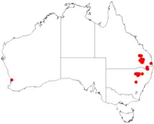 It is endemic to a small area of south eastern Queensland[2] and north eastern New South Wales and has a disjunct distribution. In New South Wales it is found to the north of the Pilliga scrub usually situated along creek banks and is often part of dry sclerophyll forest or woodland communities and grows in sandy soils.[1] The range of the plant extends from around Taroom in the north down to the Pilliga East State Forest in the south west and Tenterfield in the south east.[2]