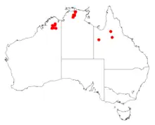 It is native to an area in the Kimberley region of Western Australia[1] and the top end of the Northern Territory. It is usually situated on stony or rocky plateaux or hillslopes often in shrubland or open Eucalyptus savannah communities.[2]