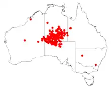 The tree is found in north western parts of South Australia,[4] southern parts of the Northern Territory and eastern parts of the Pilbara and Goldfields regions of Western Australia.[3]