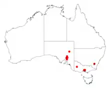 The shrub is scattered in an area of South Australia in the southern Flinders Ranges and the northern Mount Lofty Ranges[3] from around Wilmington in the north down to around Port Pirie in the south where it is often situated in gorges or on rocky hillsides growing in shallow loamy soils as a part of scrubby Eucalyptus woodland communities.[2]