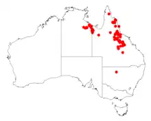 It is endemic to an area in the western part of the top end of the Northern Territory and north-western parts of Queensland. It is also found along the Great Dividing Range in Queensland from around Torrens Creek in the north down to about 150 km (93 mi) north of Clermont where it is often situated on slopes and ridges growing in sandt, clayey or rocky soils around and over sandstone or granite as a part of Acacia or Eucalyptus woodland communities.[1]